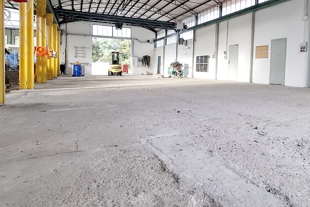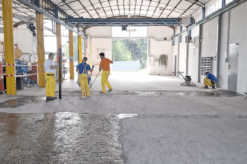 L’azienda aveva una pavimentazione industriale datata e fortemente deteriorata, con un dislivello e un consumo tali da richiedere un ripristino volumetrico importante per recuperare lo spessore e riportare la superficie in quota.